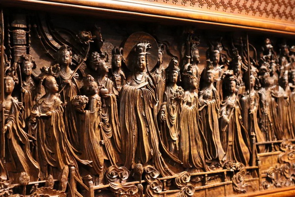 木雕作品《八十七神仙卷》以唐代畫家吳道子的同名繪畫為藍(lán)本,生動復(fù)刻了道教故事中帝君引領(lǐng)八十七位神仙出行的宏大場景。該幅作品中,三位帝君眉眼微垂,雍容華貴,寶相莊嚴(yán),神將威風(fēng)凜凜、氣宇軒昂;眾多仙女的珠環(huán)玉佩,輕盈秀麗,將眾仙家多種神態(tài)刻畫的栩栩如生。眾仙服飾線條飄逸靈動,就連仙女的秀髻云鬢,頭頂?shù)拟O環(huán)配飾,手中的羽扇陽蓬都絲絲刻畫,足可見雕刻功底之深厚。運用浮雕、疊雕等多種雕刻技法,人物層次錯落分明,在先人的偉大作品基礎(chǔ)上融入了自身的理解和創(chuàng)作。華廈·大不同在2012年創(chuàng)作這副木雕作品的初衷也是歌頌咱們祖國的日益強大,作品以緬甸花梨為材,克服了紅木密度、硬度高的雕刻難點,更提升了作品的價值。